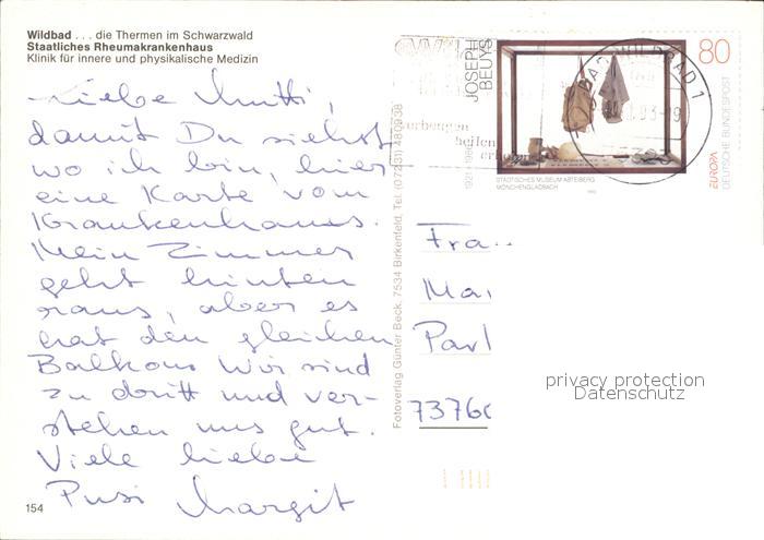 72466425 alte Postkarte Wildbad Schwarzwald Staatl Rheumakrankenhaus postalisch gelaufen Erhaltung siehe scans KatCode: 11110008235079