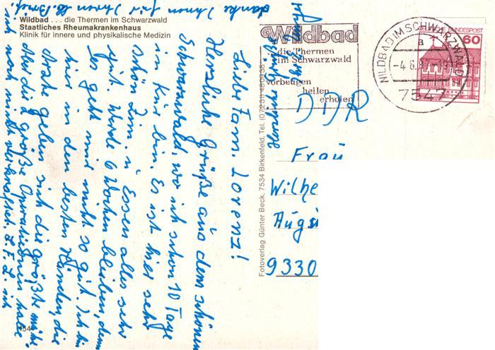 73907727 alte Postkarte Wildbad Schwarzwald Staatliches Rheumakrankenhaus postalisch gelaufen Erhaltung siehe scans [WerneD78] KatCode: 11110008235079