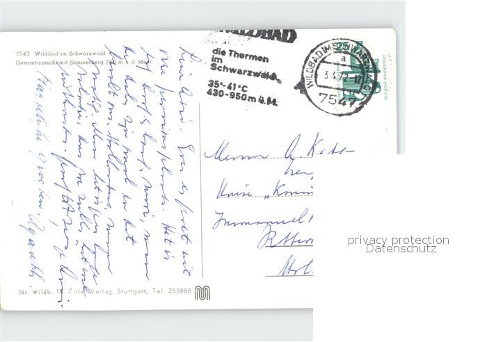 72259144 alte Postkarte Wildbad Schwarzwald Stadtblick mit Sommerberg postalisch gelaufen Erhaltung siehe scans KatCode: 11110008235079