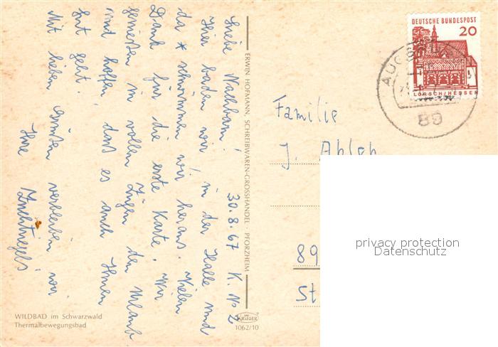 72991229 alte Postkarte Wildbad Schwarzwald Thermalbewegungsbad postalisch gelaufen Erhaltung siehe scans [WerneD78] KatCode: 11110008235079