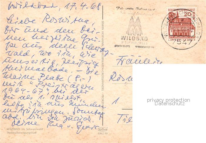 73512354 alte Postkarte Wildbad Schwarzwald Thermalbewegungsbad postalisch gelaufen Erhaltung siehe scans [WerneD78] KatCode: 11110008235079