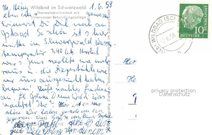 72747948 alte Postkarte Wildbad Schwarzwald Thermalschwimmbad postalisch gelaufen Erhaltung siehe scans [FriedD77] KatCode: 11110008235079