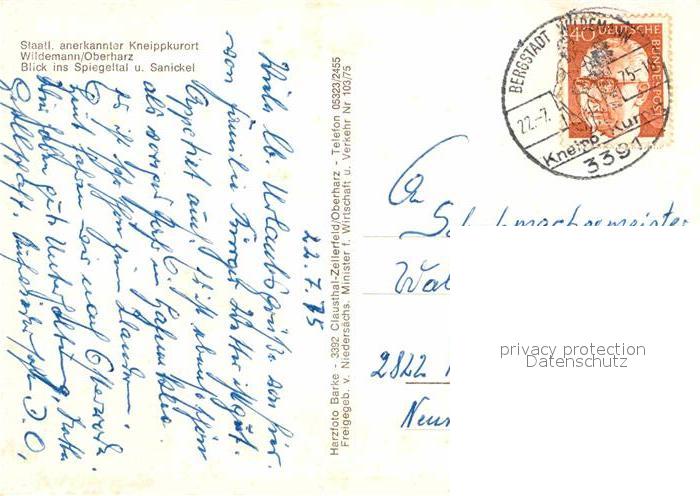 72781096 alte Postkarte Wildemann Harz Goslar Niedersachsen Kneippkurort Blick ins Spiegeltal und Sanickel Fliegeraufnahme postalisch gelaufen Erhaltung siehe scans [FriedD77] KatCode: 11110003153015