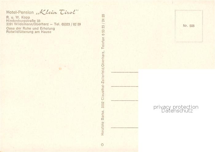 73843643 Wildemann Harz Hotel Pension Klein Tirol postalisch nicht gelaufen Erhaltung siehe scans [WerneD78] KatCode: 11110003153015