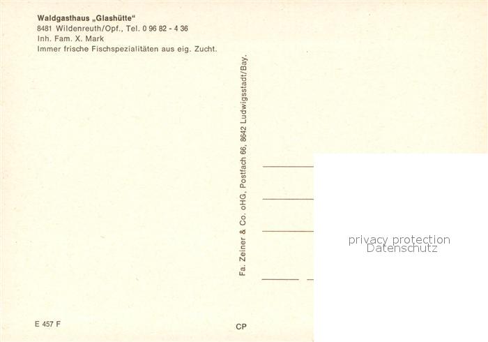 73662533 Wildenreuth Waldgasthaus Glashuette Fischteich Huette postalisch nicht gelaufen Erhaltung siehe scans [FriedD77] KatCode: 11110009377116