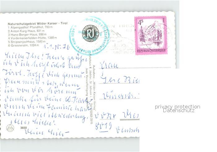 72362287 alte Postkarte Wilder Kaiser Pfandhof Anton-Karg-Haus Vorderkaiserfelden-Huette Stripsenjochhaus Griesneralm postalisch gelaufen Erhaltung siehe scans KatCode: 11390332070368