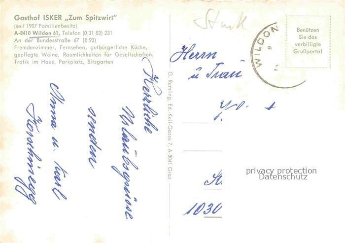 74156423 alte Postkarte Wildon Steiermark AT Gasthof-Isker Zum-Spitzwirt Kirchturm Angler Fluss Bergpanorama Gaststube Landschaft postalisch gelaufen Erhaltung siehe scans [Karloger] KatCode: 11390225061047