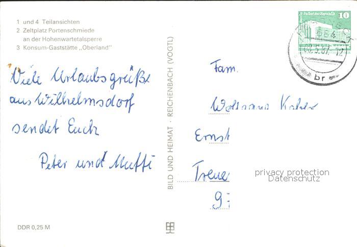 72335115 alte Postkarte Wilhelmsdorf Poessneck Teilansichten Zeltplatz Portenschmiede Hohenwartetalsperre Konsum Gaststaette Oberland postalisch gelaufen Erhaltung siehe scans KatCode: 11110016075125