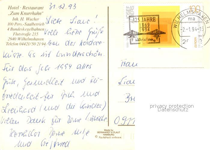 73724436 Wilhelmshaven CITY Hotel Zum Knurrhahn Restaurant Gaststube Zimmer postalisch gelaufen Erhaltung siehe scans [WerneD78] alte Postkarte Wern Katcode 11110003405000