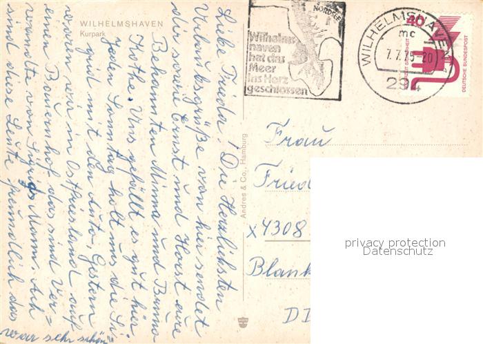 73072236 alte Postkarte Wilhelmshaven Kurpark Uferpromenade Skulptur postalisch gelaufen Erhaltung siehe scans [FriedD77] KatCode: 11110003405000