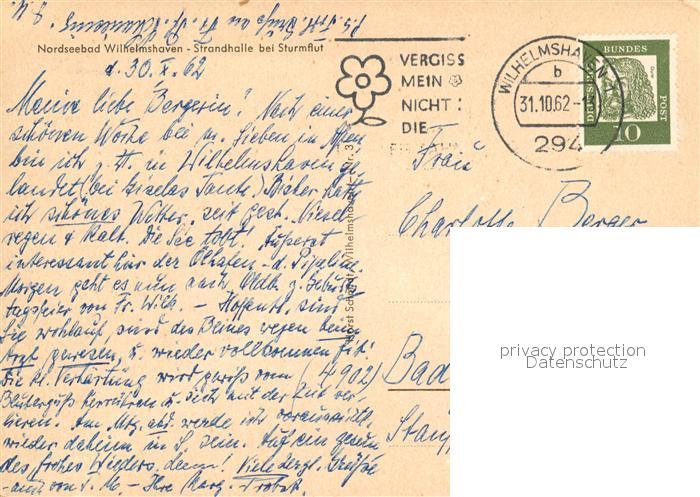 73072277 alte Postkarte Wilhelmshaven Strandhalle bei Sturmflut Nordseebad postalisch gelaufen Erhaltung siehe scans [FriedD77] KatCode: 11110003405000