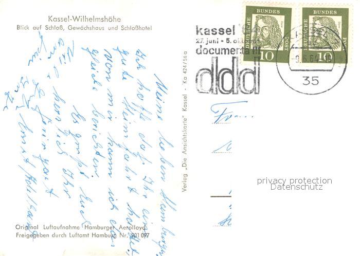 72956008 alte Postkarte Wilhelmshoehe Kassel Fliegeraufnahme Schloss Gewaechshaus Schlosshotel postalisch gelaufen Erhaltung siehe scans [PaolaD17] KatCode: 11110006611000