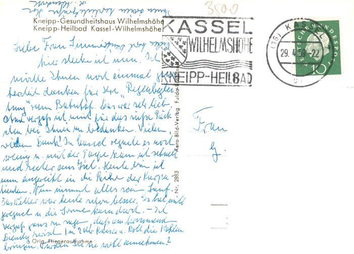 73915002 alte Postkarte Wilhelmshoehe Kassel Kneipp Heilbad Fliegeraufnahme postalisch gelaufen Erhaltung siehe scans [FriedD77] KatCode: 11110006611000