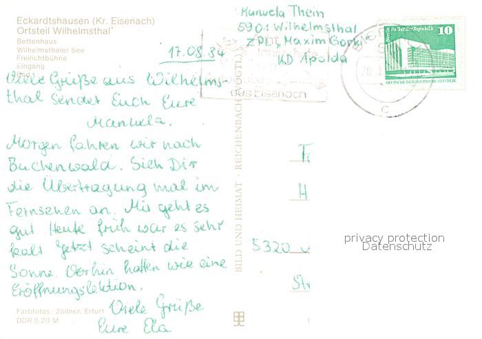 73544803 alte Postkarte Wilhelmsthal Eisenach Zentrales Pionierlager Maxim Gorki Bettenahsu See Freilichtbuehne Freibad postalisch gelaufen Erhaltung siehe scans [FriedD77] KatCode: 11110016056000