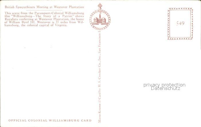 72253846 Williamsburg Virginia British Sympathizers Meeting at Westover Planatation postalisch nicht gelaufen Erhaltung siehe scans KatCode: 14140490000000