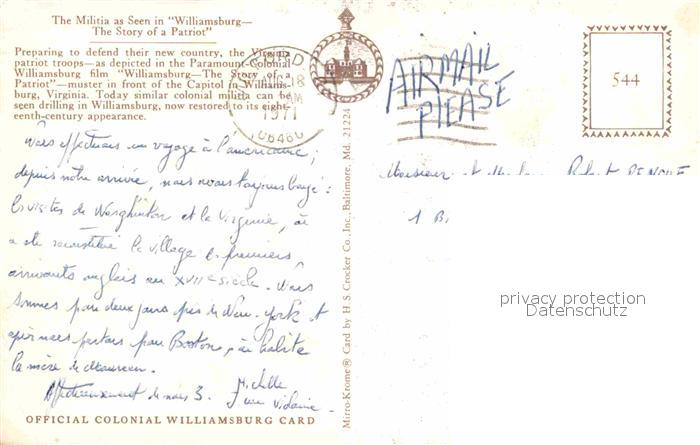 72897182 old postcard Williamsburg Virginia Patriotische Geschichte postalisch gelaufen Erhaltung siehe scans [AndreD76] KatCode: 14140490000000
