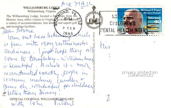 73126226 old postcard Williamsburg Virginia Williamsburg Lodge postalisch gelaufen Erhaltung siehe scans [KathaD81] KatCode: 14140490000000