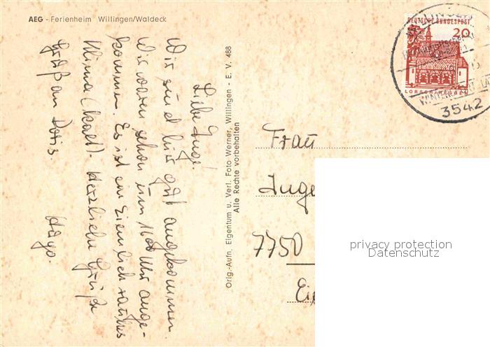 72752523 alte Postkarte Willingen Sauerland AEG Ferienheim postalisch gelaufen Erhaltung siehe scans [LiesaD40] KatCode: 11110006635022