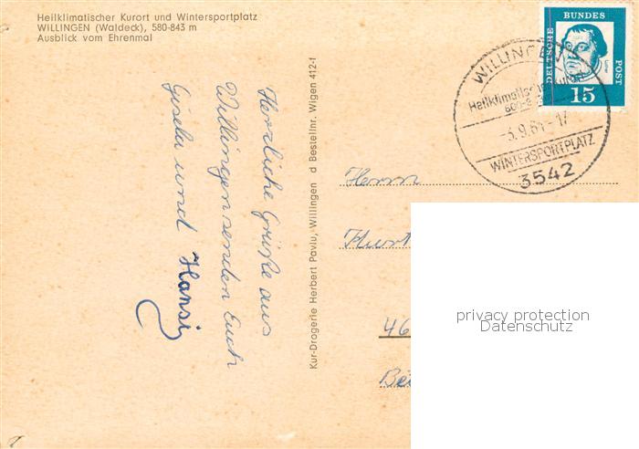 73814311 alte Postkarte Willingen Sauerland Ausblick vom Ehrenmal postalisch gelaufen Erhaltung siehe scans [FriedD77] KatCode: 11110006635022
