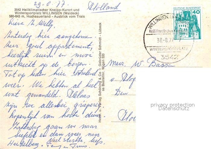 72663419 alte Postkarte Willingen Sauerland Ausblick vom Trais Heilklimatischer Kneipp Kurort postalisch gelaufen Erhaltung siehe scans [FriedD77] KatCode: 11110006635022