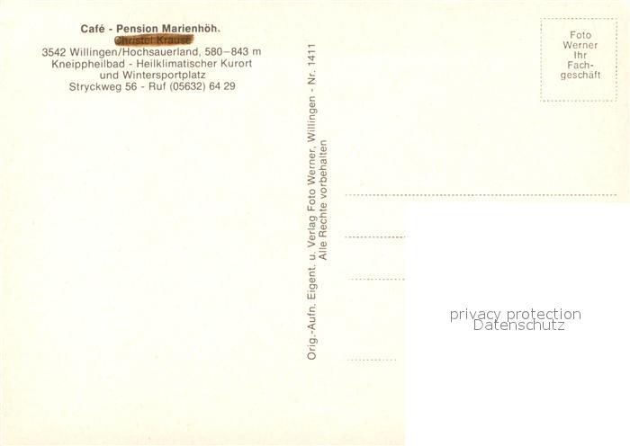 73542322 Willingen Sauerland Cafe Pension Haus Marienhoehe postalisch nicht gelaufen Erhaltung siehe scans [KathaD81] KatCode: 11110006635022