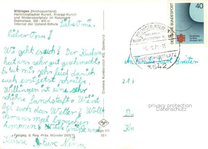 73776648 alte Postkarte Willingen Sauerland Fliegeraufnahme Internat der Upland Schule postalisch gelaufen Erhaltung siehe scans [WerneD78] KatCode: 11110006635022