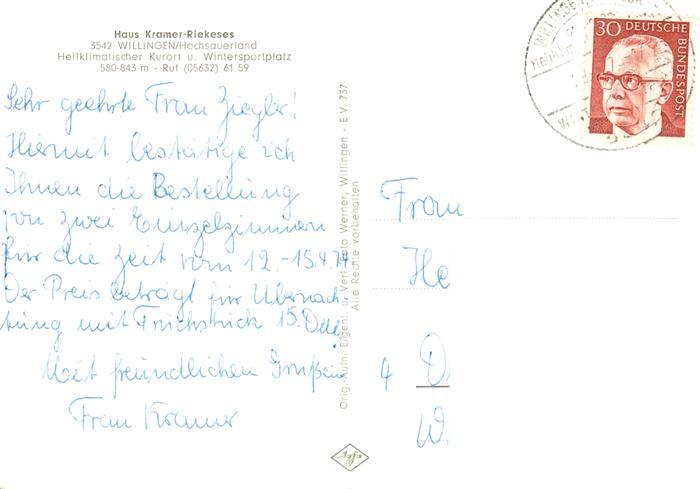 73902860 alte Postkarte Willingen Sauerland Haus Kramer Riekeses Gastraeume Panorama postalisch gelaufen Erhaltung siehe scans [WerneD78] KatCode: 11110006635022