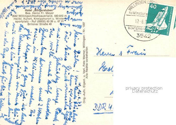 73052097 alte Postkarte Willingen Sauerland Hotel Buergerstuben postalisch gelaufen Erhaltung siehe scans [NatalD47] KatCode: 11110006635022