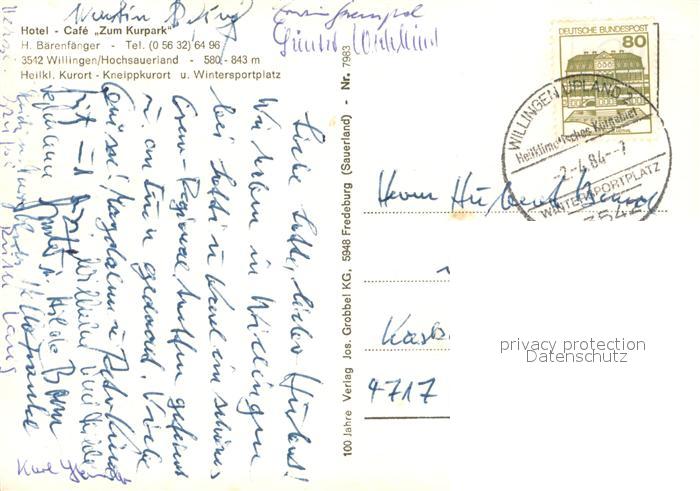 73720293 alte Postkarte Willingen Sauerland Hotel Cafe Zum Kurpark Terrasse postalisch gelaufen Erhaltung siehe scans [WerneD78] KatCode: 11110006635022