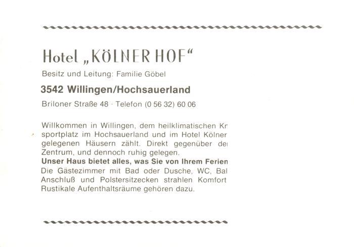 73923693 Willingen Sauerland Hotel Koelner Hof postalisch nicht gelaufen Werbekarte (keine Postkarte) Erhaltung siehe scans [WerneD78] KatCode: 11110006635022