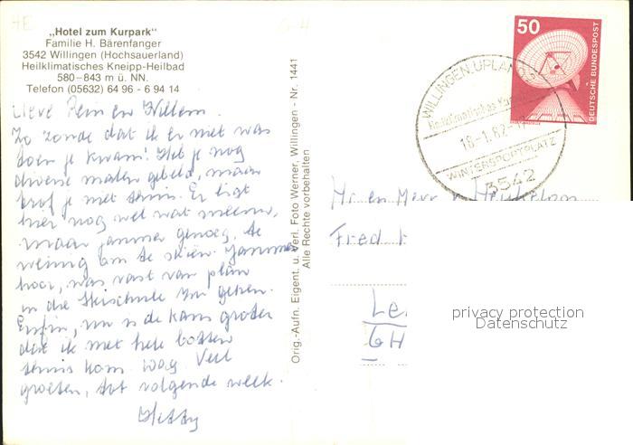 71866258 alte Postkarte Willingen Sauerland Hotel zum Kurpark postalisch gelaufen Erhaltung siehe scans KatCode: 11110006635022