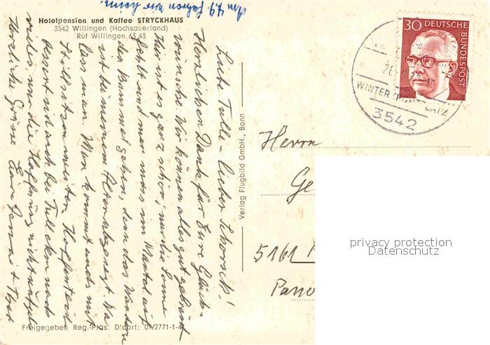 72888293 alte Postkarte Willingen Sauerland Hotelpension Kaffee Stryckhaus postalisch gelaufen Erhaltung siehe scans [FriedD77] KatCode: 11110006635022