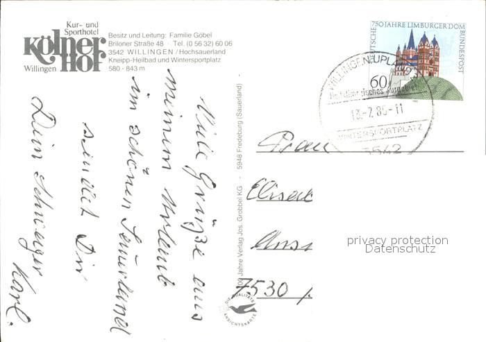 72001972 alte Postkarte Willingen Sauerland Kur Sporthotel Koelner Hof postalisch gelaufen Erhaltung siehe scans KatCode: 11110006635022