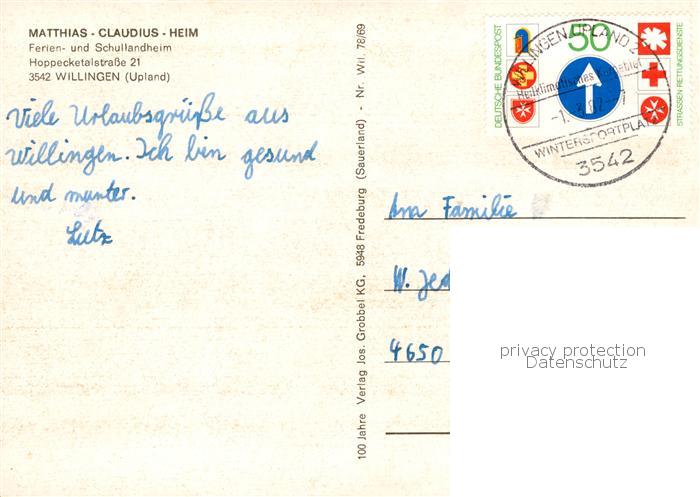 73833737 alte Postkarte Willingen Sauerland Matthias Claudius Heim Gastraeume Panorama postalisch gelaufen Erhaltung siehe scans [FriedD77] KatCode: 11110006635022