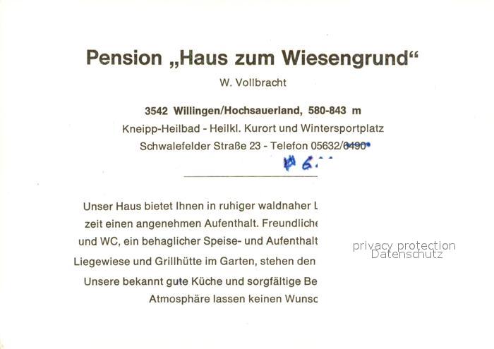 73660981 Willingen Sauerland Pension Haus zum Wiesengrund postalisch nicht gelaufen Werbekarte (keine Postkarte) Erhaltung siehe scans [FriedD77] KatCode: 11110006635022