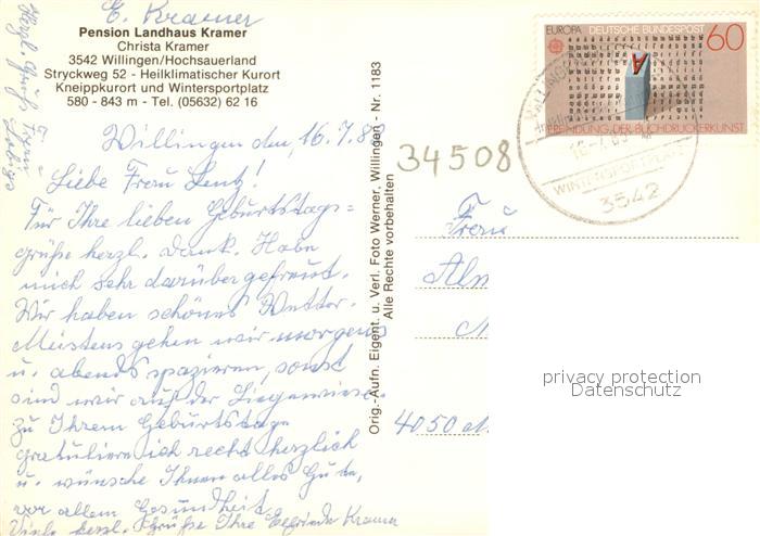 73542296 alte Postkarte Willingen Sauerland Pension Landhaus Kramer postalisch gelaufen Erhaltung siehe scans [KathaD81] KatCode: 11110006635022