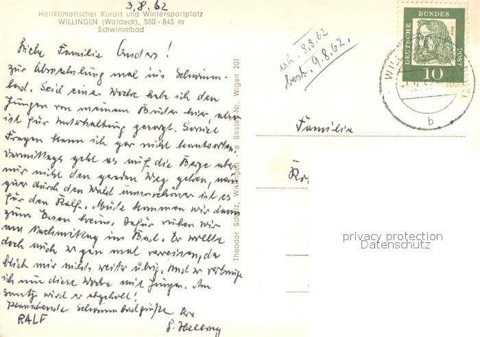 73686543 alte Postkarte Willingen Sauerland Schwimmbad Bruecke Heilklimatischer Kurort postalisch gelaufen Erhaltung siehe scans [FriedD77] KatCode: 11110006635022