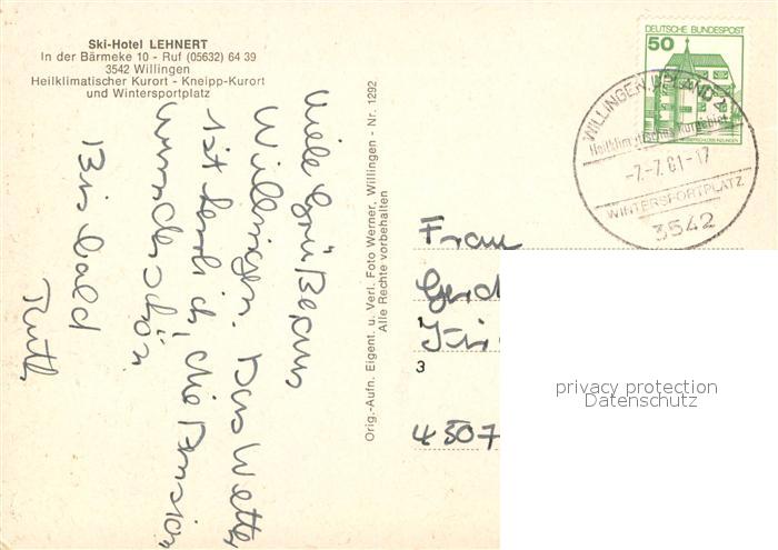 73714194 alte Postkarte Willingen Sauerland Ski-Hotel Lehnert Aussenansicht postalisch gelaufen Erhaltung siehe scans [LiesaD40] KatCode: 11110006635022