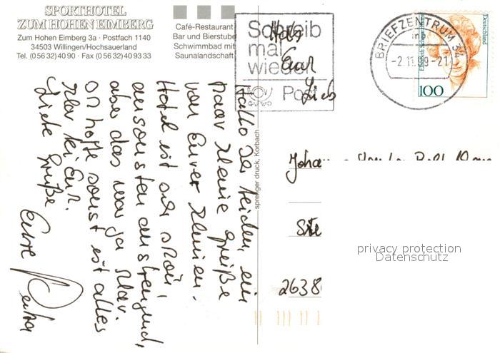73323206 alte Postkarte Willingen Sauerland Sporthotel Zum hohen Eimberg postalisch gelaufen Erhaltung siehe scans [FriedD77] KatCode: 11110006635022