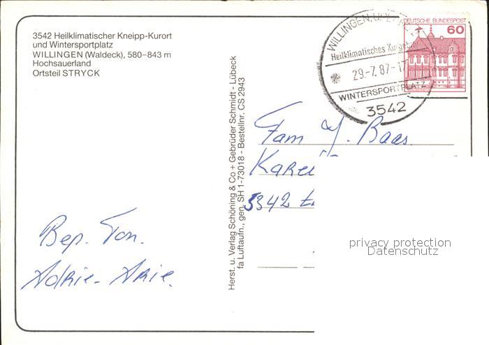 72243169 alte Postkarte Willingen Sauerland Stryck Fliegeraufnahme postalisch gelaufen Erhaltung siehe scans KatCode: 11110006635022