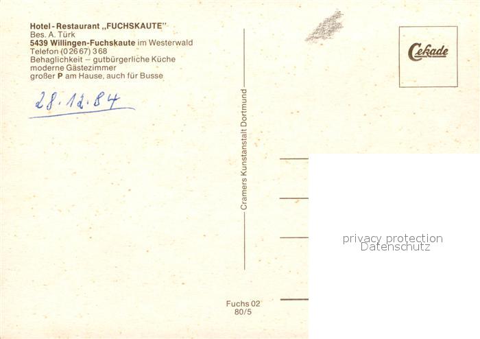 73182101 Willingen Westerwald Hotel Restaurant Fuchskaute Speisesaal Zimmer Gastraum postalisch nicht gelaufen Erhaltung siehe scans [WerneD78] KatCode: 11110007143311