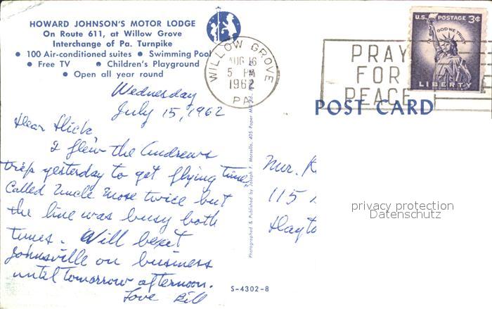 71953204 old postcard Willow Grove Howerd Jonson’s Motor Lodge postalisch gelaufen Erhaltung siehe scans KatCode: 14140410000000