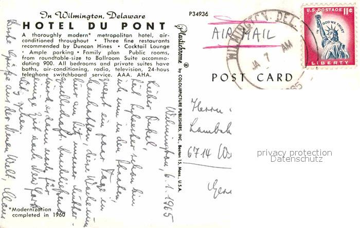 72905620 old postcard Wilmington Delaware Hotel du Pont at night postalisch gelaufen Erhaltung siehe scans [FriedD77] KatCode: 14140080000000