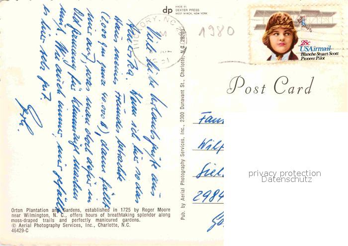 72914661 old postcard Wilmington North Carolina Orton Plantation Gardens postalisch gelaufen Erhaltung siehe scans [NatalD47] KatCode: 14140350000000