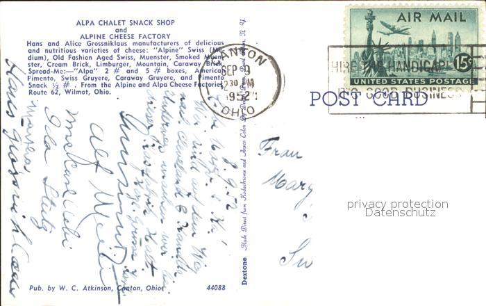 11688546 old postcard Wilmot Ohio Alpa Chalet Snack Shop Alpine Cheese Factory postalisch gelaufen KatCode: 14140370000000