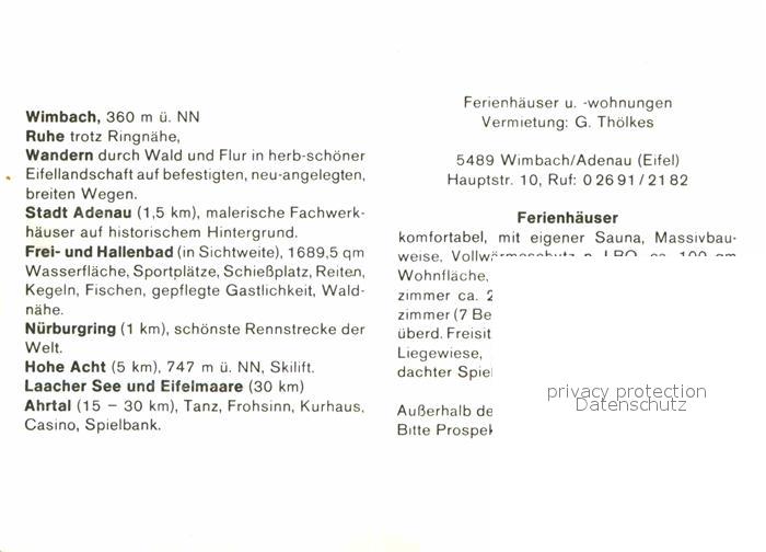 72838689 Wimbach Adenau Feriendorf postalisch nicht gelaufen Werbekarte (keine Postkarte) Erhaltung siehe scans [AndreD76] KatCode: 11110007131084