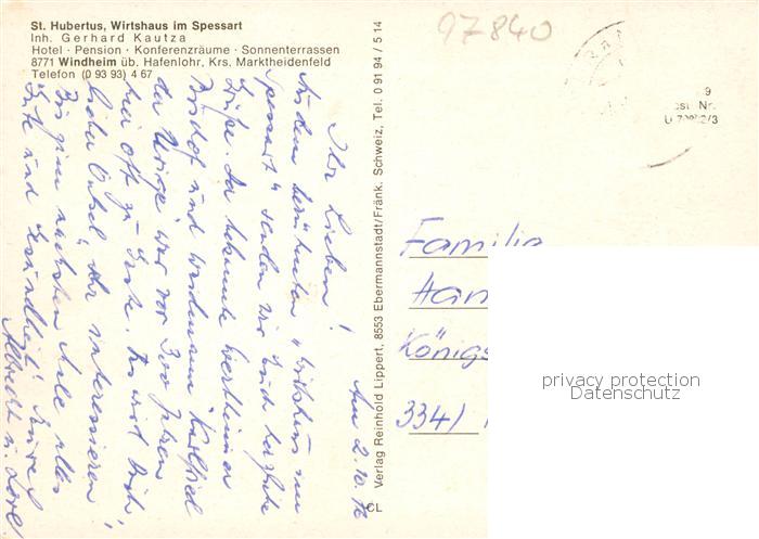 73865288 alte Postkarte Windheim Hafenlohr St. Hubertus Wirtshaus im Spessart postalisch gelaufen Erhaltung siehe scans [FriedD77] KatCode: 11110009677135