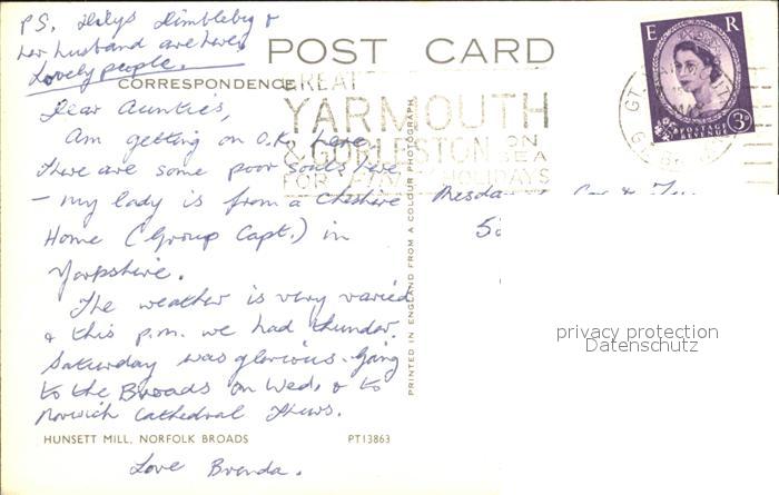 alte Postkarte Windmuehle Hunsett Mill Norfolk Broads postalisch gelaufen Erhaltung siehe scans