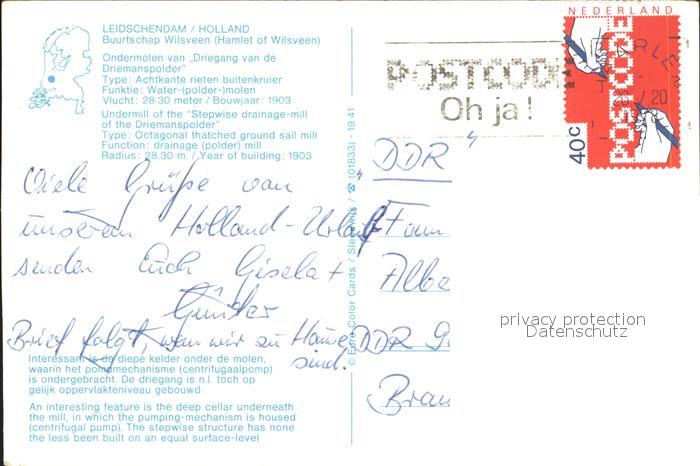 alte Postkarte Windmuehle Leidschendam Ondermolen van Driegang van de Driemanspolder postalisch gelaufen Erhaltung siehe scans