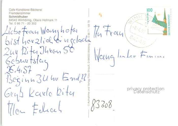 73615851 alte Postkarte Winhoering Cafe Konditorei Schmidhuber Kuchentheke Eingangstor postalisch gelaufen Erhaltung siehe scans [WerneD78] KatCode: 11110009171137